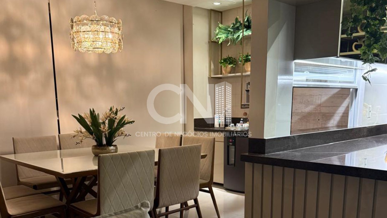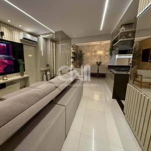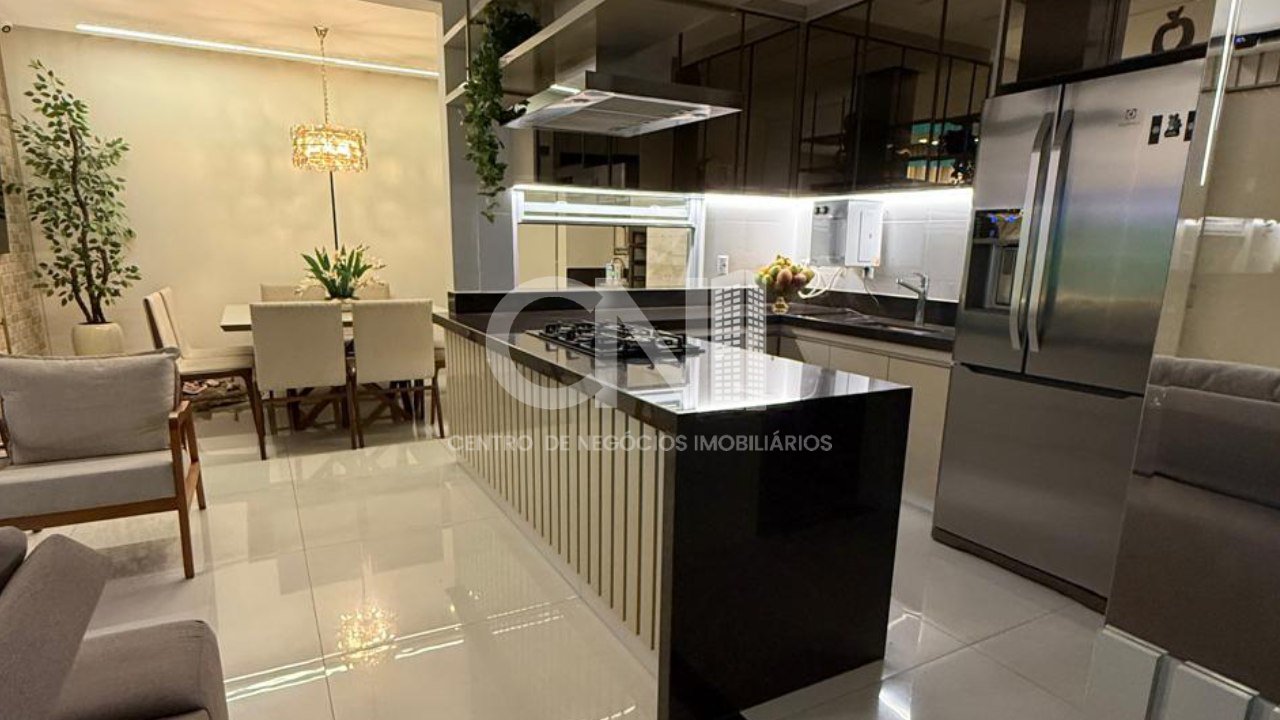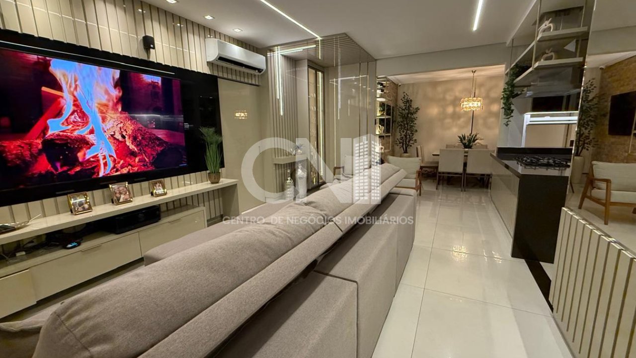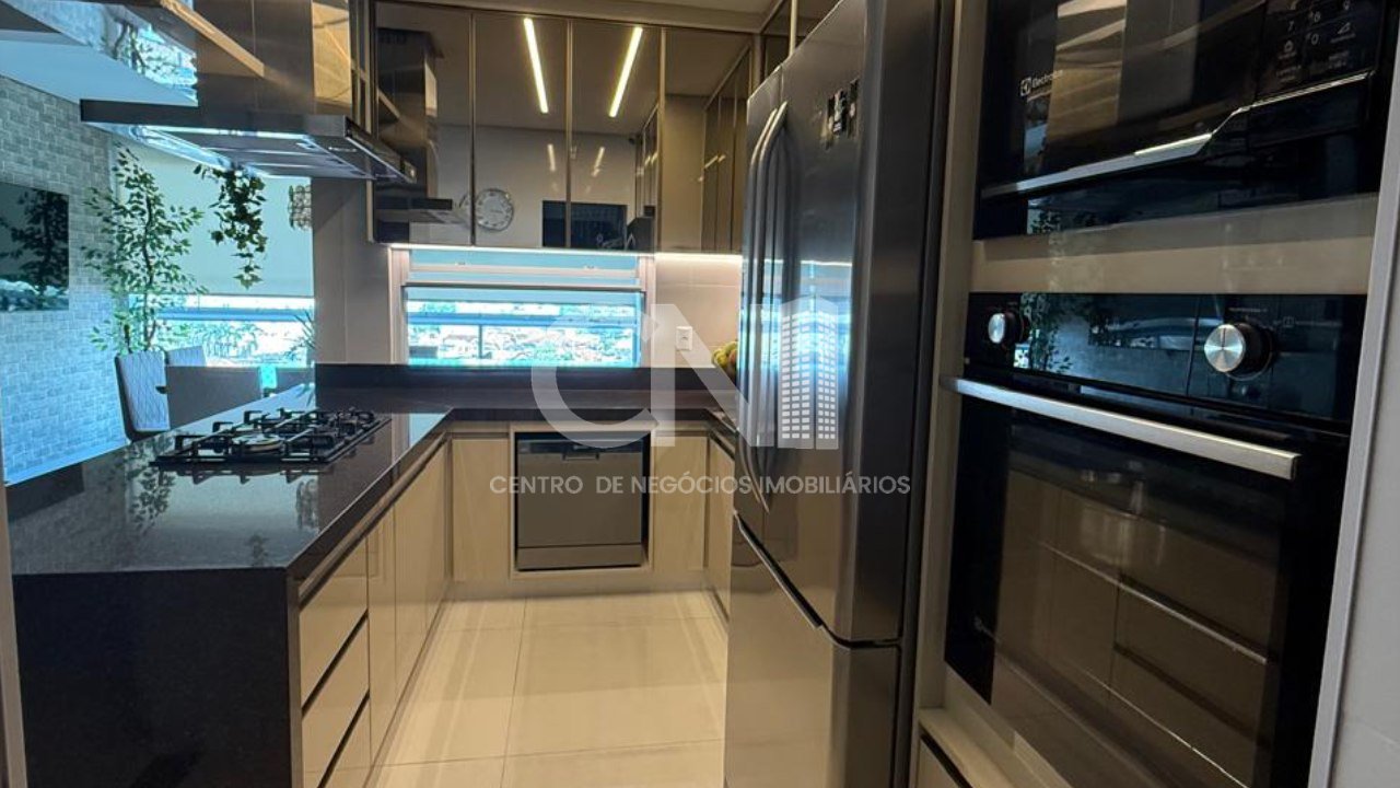 A cozinha é um verdadeiro destaque, com fogão em ilha, coifa moderna, micro-ondas, forno elétrico, geladeira inox, lava-louças e armários sob medida com acabamento reflecta bronze. Na sala, um painel com espelho e cristaleira cria um ambiente acolhedor, complementado por cortinas automatizadas para maior conforto.